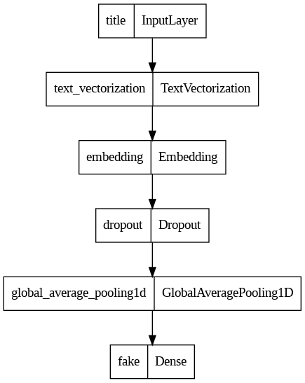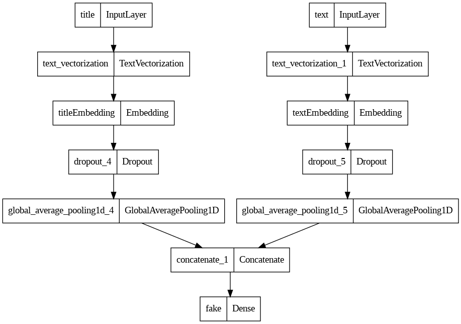 title_outputs = layers.Dense(2,activation='softmax',name="fake")(x)title_model = keras.Model(inputs=title_inputs,outputs=title_outputs)Here’s what our model looks like: